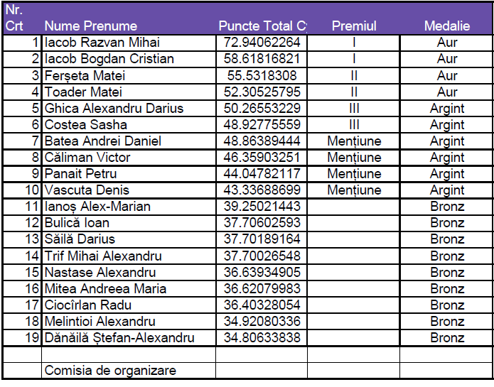 Din cauza nerespectării codului de onoare privind participarea la un concurs individual, doi dintre concurenți nu se regăsesc în lista de rezultate, fiind eliminați din concurs, pe baza analizei comportamentului din timpul concursului.